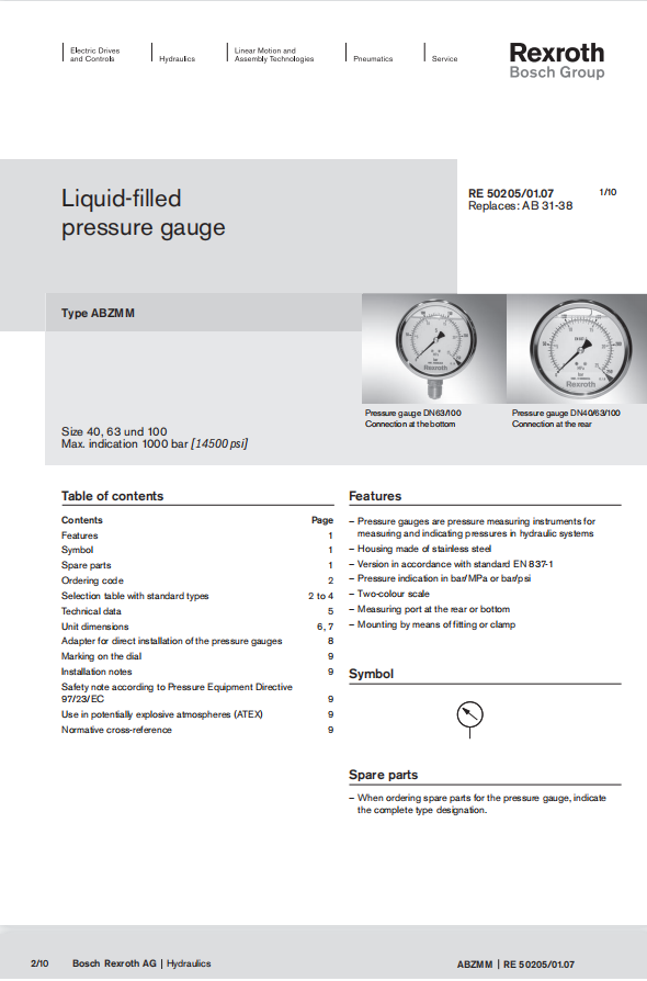 力士樂(lè)壓力表ABZMM系列型號(hào)樣本,安裝及使用說(shuō)明書(shū)