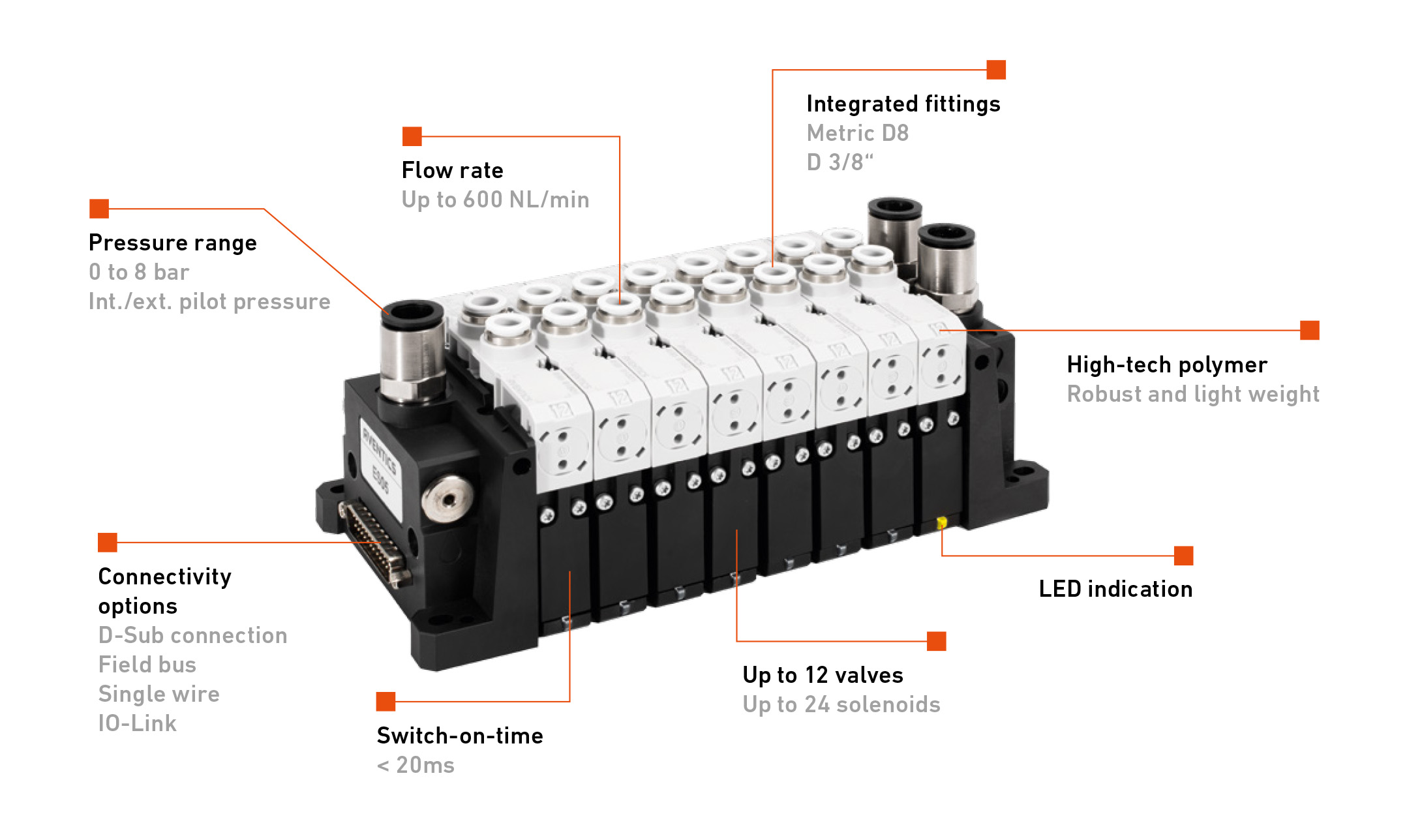 所有ES05閥門均由輕質(zhì)聚合物制成,提供LED指示和快速切換時間。ES05歧管非常靈活,只需一個工具即可輕松進(jìn)行現(xiàn)場修改(每個歧管隨附)。