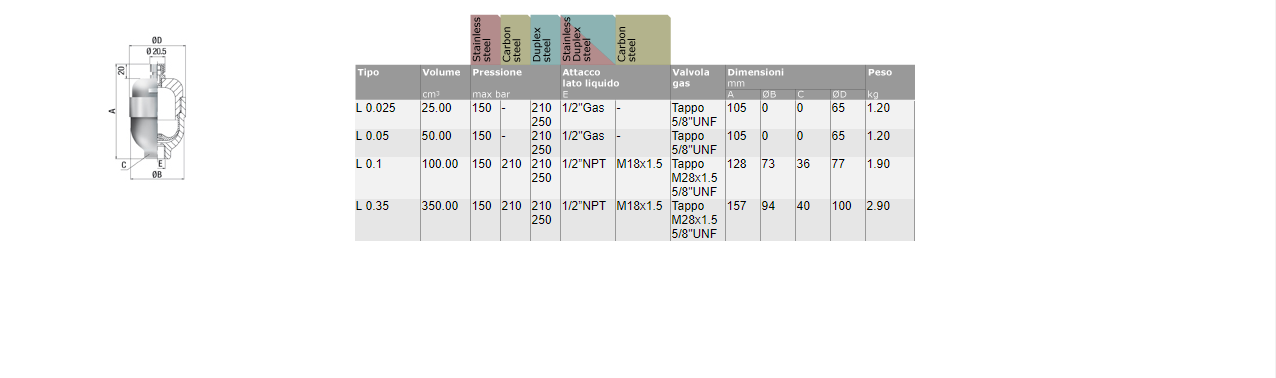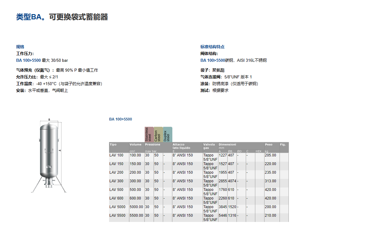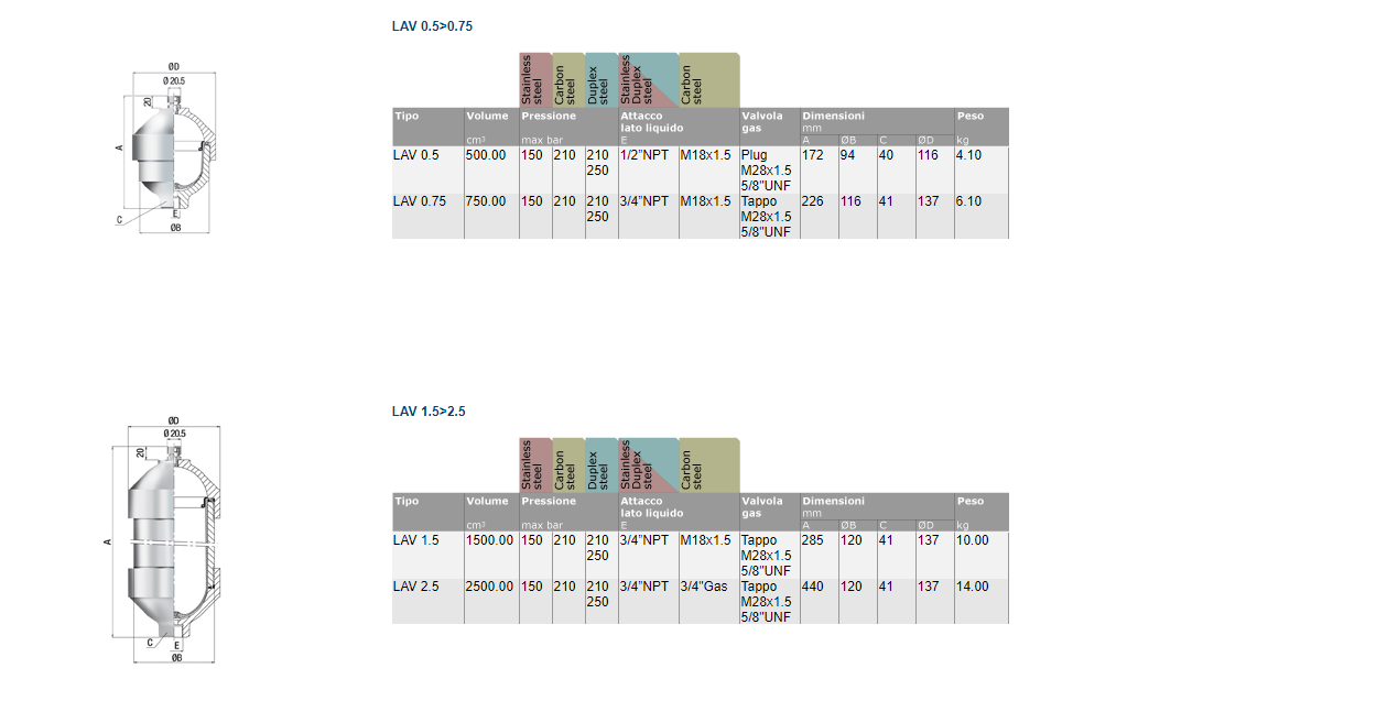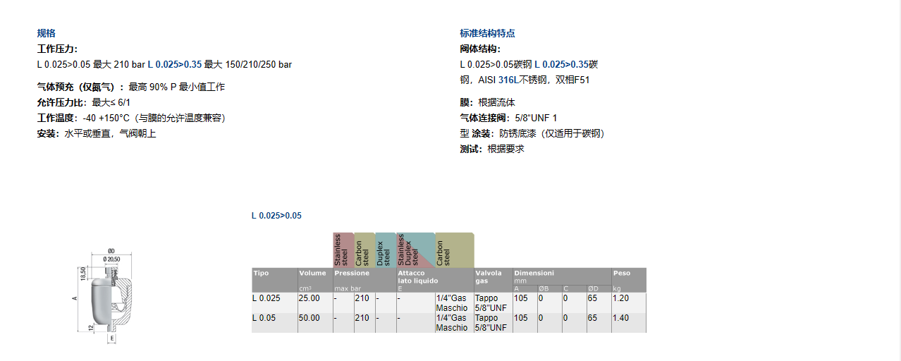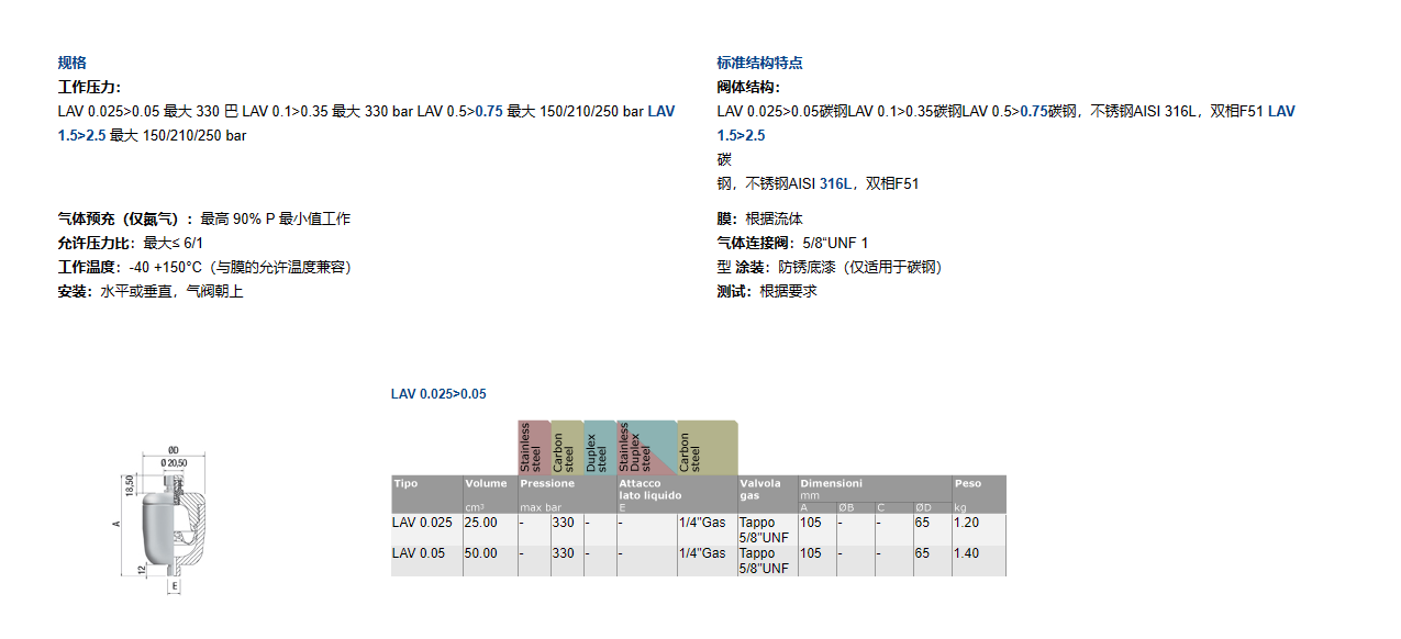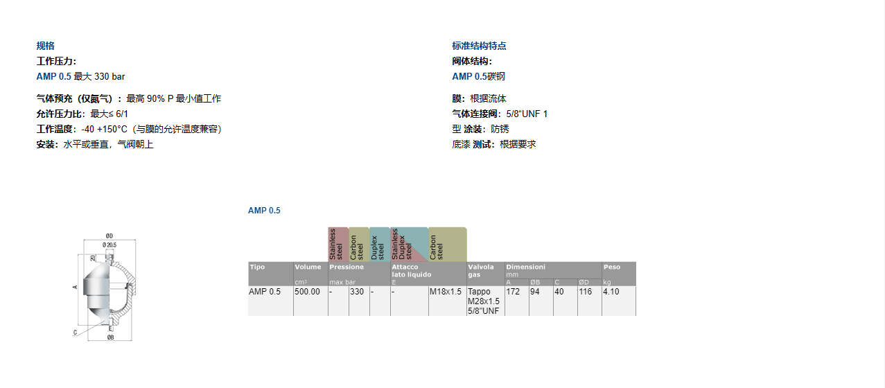 在Saip在線商店中,您可以找到各種各樣的膜蓄能器,例如經(jīng)典的AMP 0.5 Lt碳鋼P.max 330 bar。它由碳鋼、不銹鋼和雙相制成,是同類產(chǎn)品中最暢銷的產(chǎn)品之一。與 L 0.025 / 0.35 Lt 碳鋼、不銹鋼或雙相鋼一樣,P.max 150/250 bar,形狀更圓潤,末端有兩個大閥門。提出的另一篇優(yōu)秀文章是 LAV 0.025 / 2.5 Lt 由碳鋼、不銹鋼和雙相鋼制成,帶有 P.max 150 /330 bar,帶有細長的線條和側(cè)面加強件。