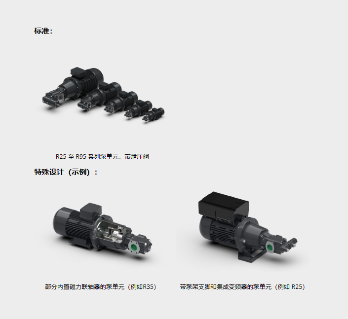 R5系列的所有齒輪泵都可以作為一個(gè)單元與電動(dòng)機(jī)、泵架、聯(lián)軸器和其他附件組合提供。