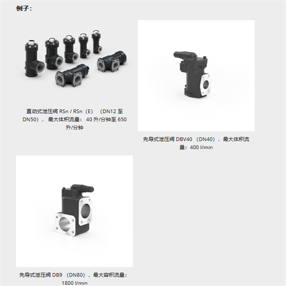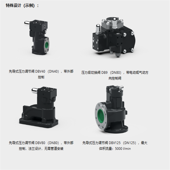 閥型號(hào):直動(dòng)式泄壓閥 RSn / RSn(E),先導(dǎo)式泄壓閥 DBV40,先導(dǎo)式泄壓閥 DB9,先導(dǎo)式壓力調(diào)節(jié)閥 DBV40 (DN40),帶外部控制,壓力級(jí)切換閥 DB9 (DN80),帶電動(dòng)或氣動(dòng)方向控制閥,先導(dǎo)式壓力調(diào)節(jié)閥 DBV80 (DN80),帶外部控制,法蘭設(shè)計(jì),無(wú)需管道安裝,先導(dǎo)式壓力調(diào)節(jié)閥 DBV125 。