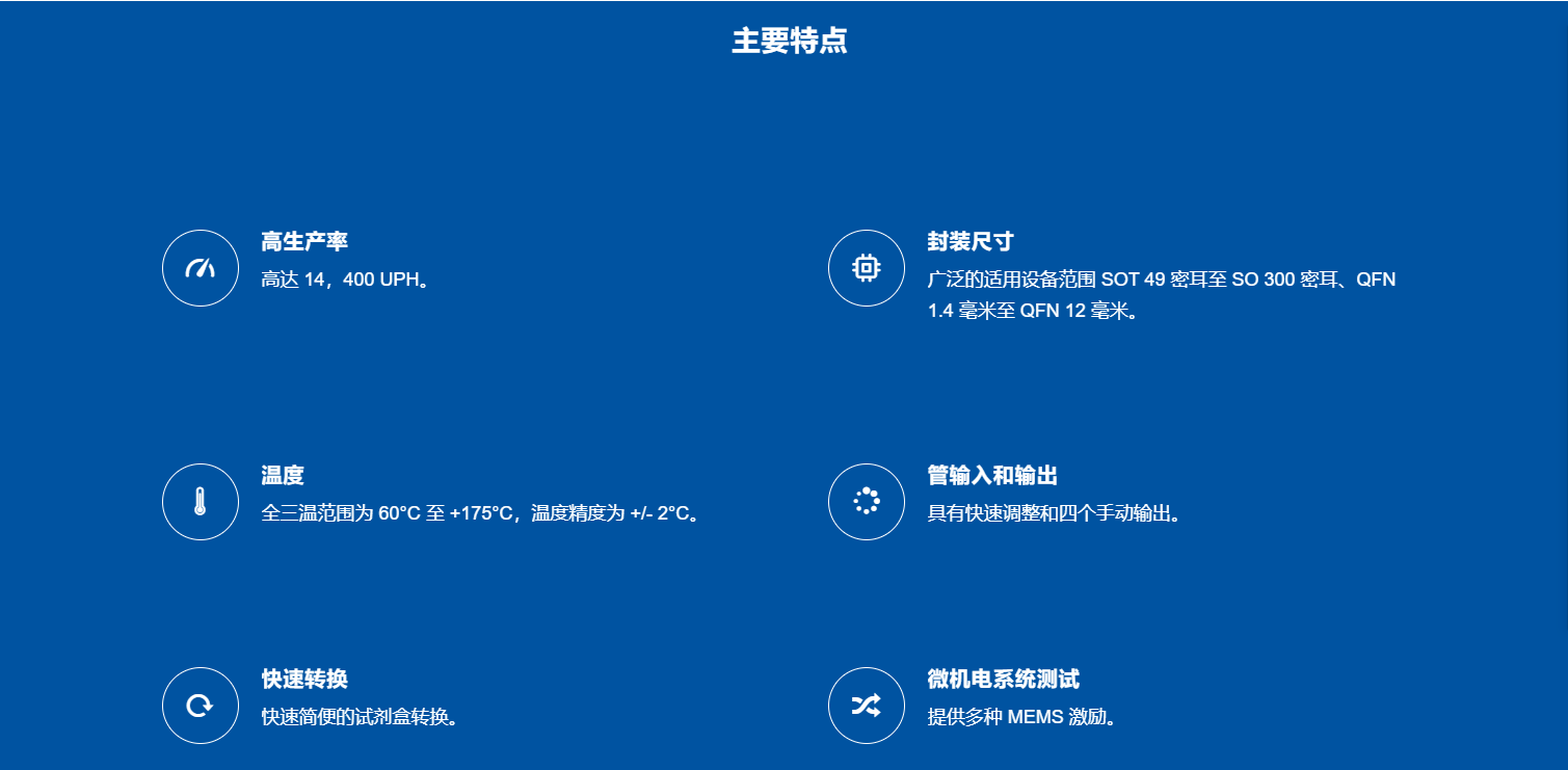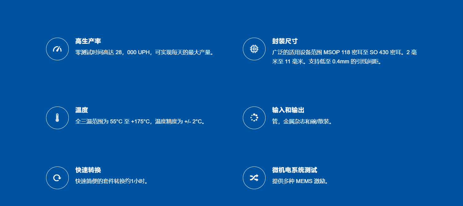 捷豹設(shè)計(jì)用于在條帶格式或器件載體中對(duì)IC進(jìn)行大批量生產(chǎn)測(cè)試。它完全符合汽車級(jí)三溫測(cè)試標(biāo)準(zhǔn),是在短時(shí)間內(nèi)對(duì)小型封裝進(jìn)行高并行測(cè)試的理想解決方案,也適用于電源和傳感器設(shè)備。