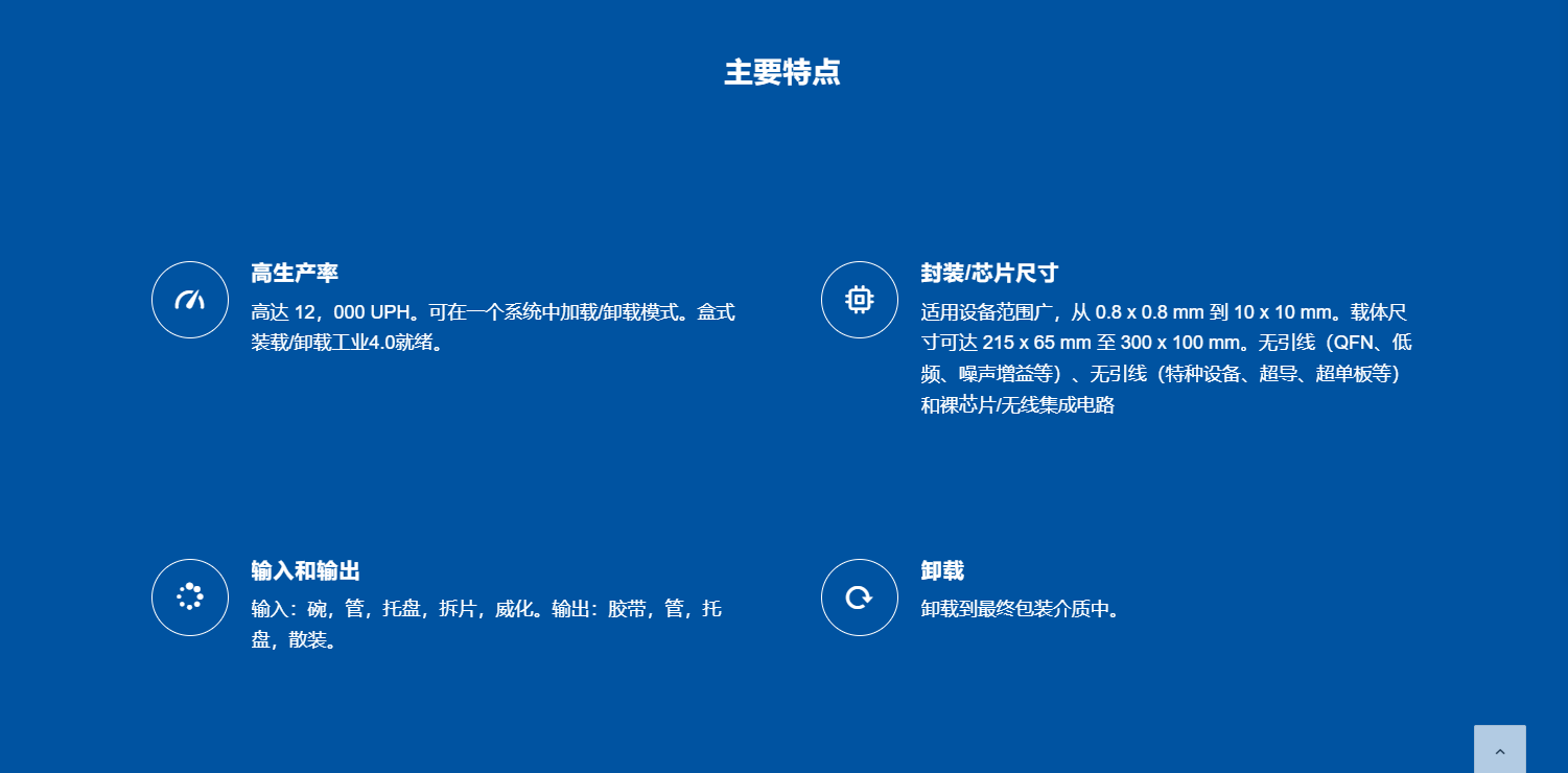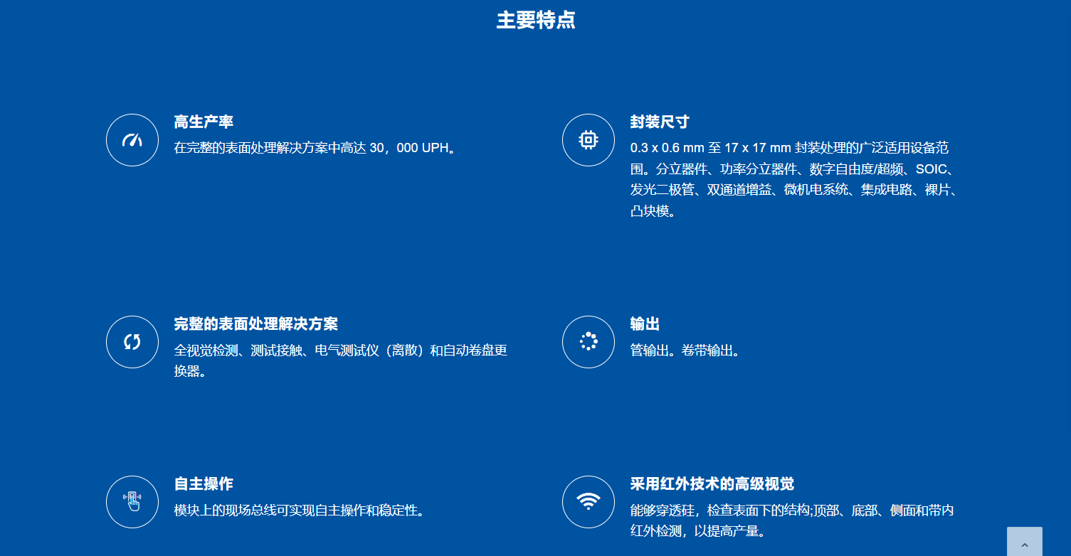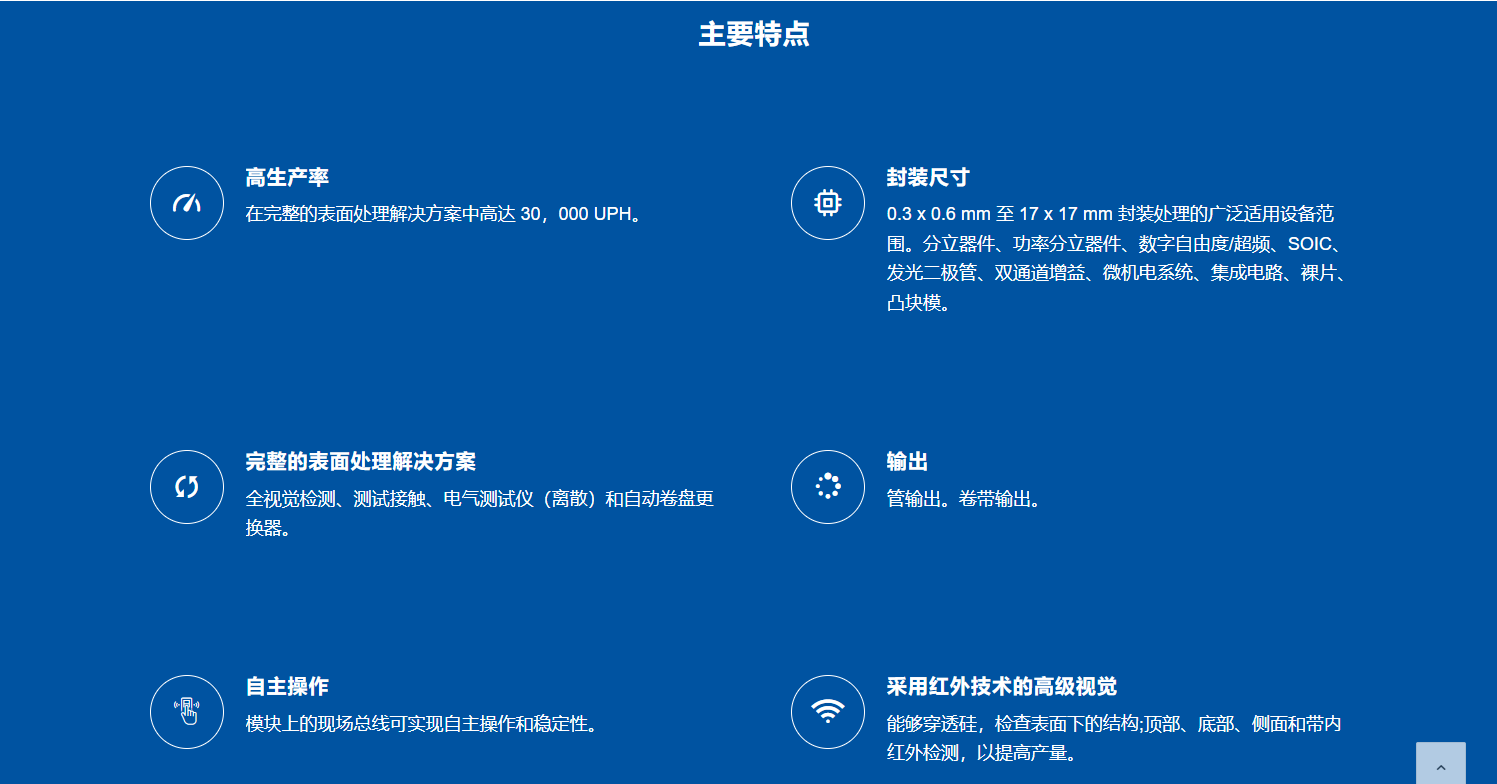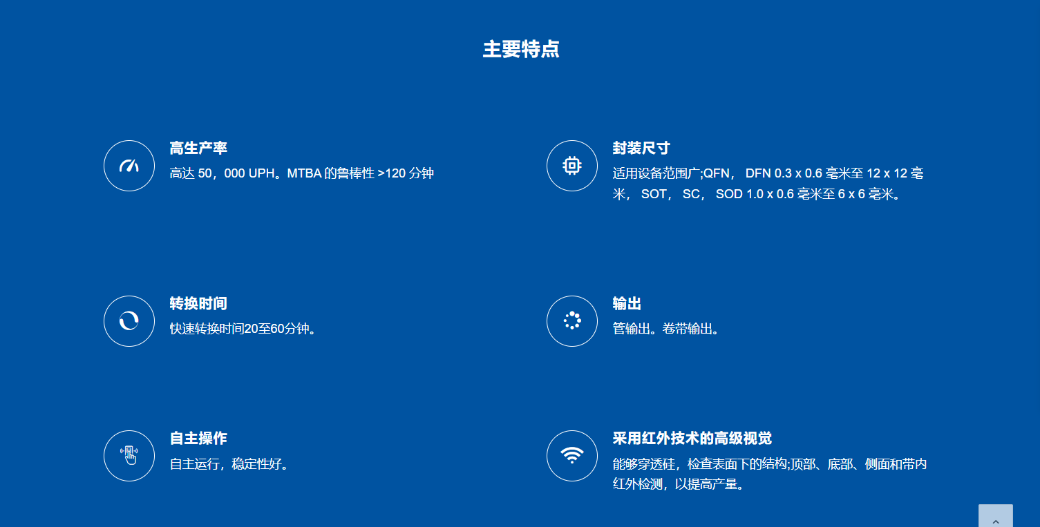 高達(dá) 50,000 UPH,適用于 ≤1 x 1 mm (45,000 ≤2 x 2 mm) 的設(shè)備,具有 HR 可見光或紅外頂部、底部和側(cè)壁檢測(cè)功能。在同一系統(tǒng)上運(yùn)行WLCSP和QFN設(shè)備和進(jìn)程。